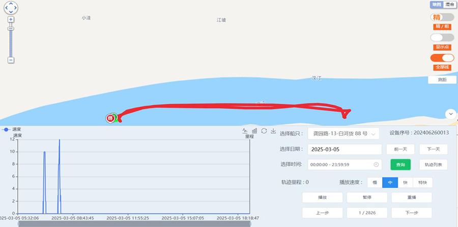 可调取每条船的历史轨迹,并且对历史轨迹回放操作,并可结合上传抓拍图片,轨迹+图片形式对历史运输过程进行回放。